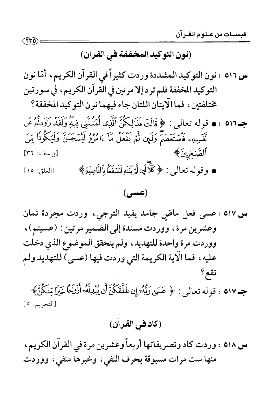 (س 516:) نون التوكيد المشددة وردت كثيرا في القرآن الكريم، أمّا نون التوكيد المخففة فلم ترد إلا مرتين في القرآن الكريم، في سورتين مختلفتين، فما الآيتان اللتان جاء فيهما نون التوكيد المخففة؟