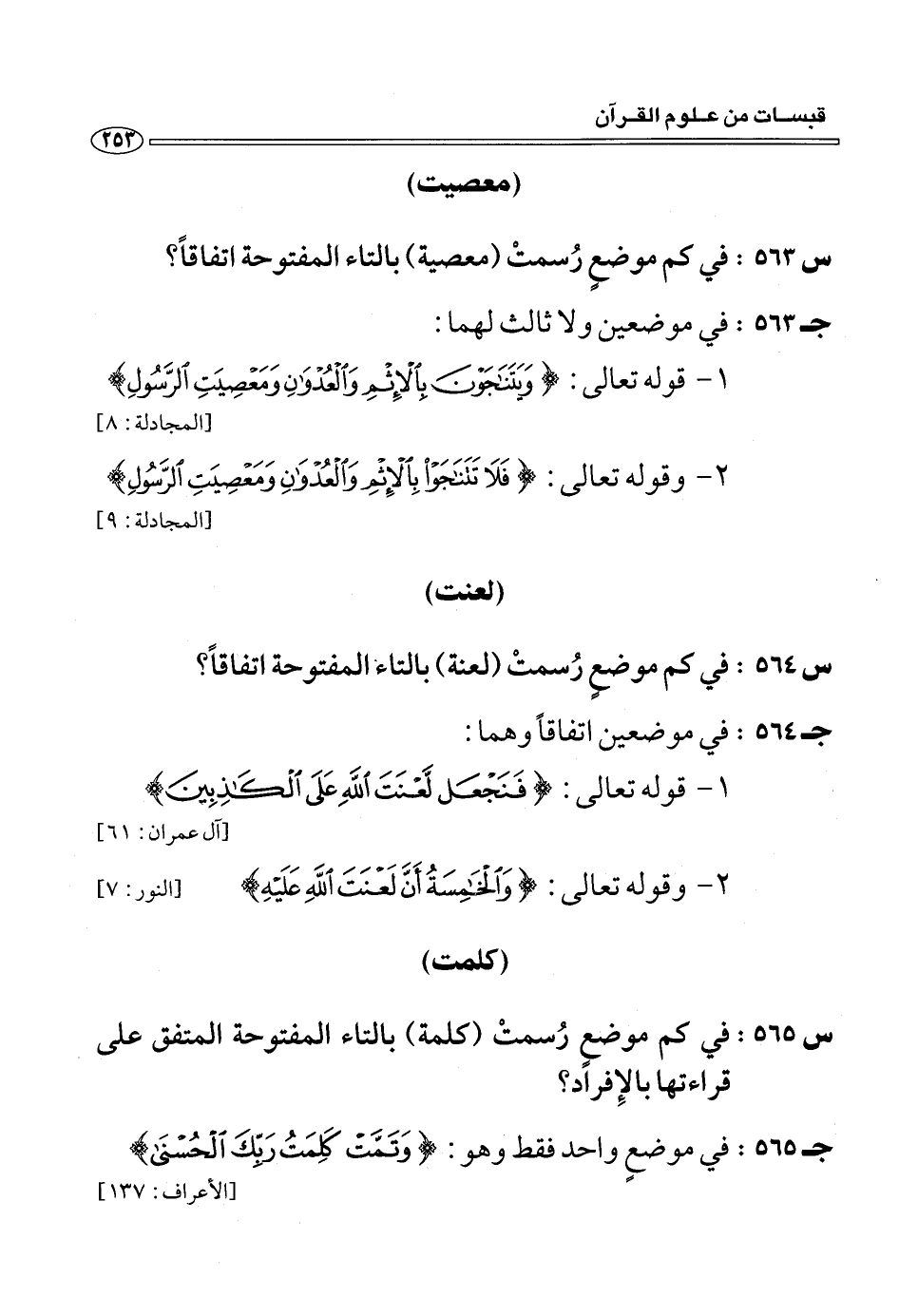 (ج 565:) في موضع واحد فقط وهو: وَتَمَّتْ كَلِمَتُ رَبِّكَ الْحُسْنى [الأعراف: 137]