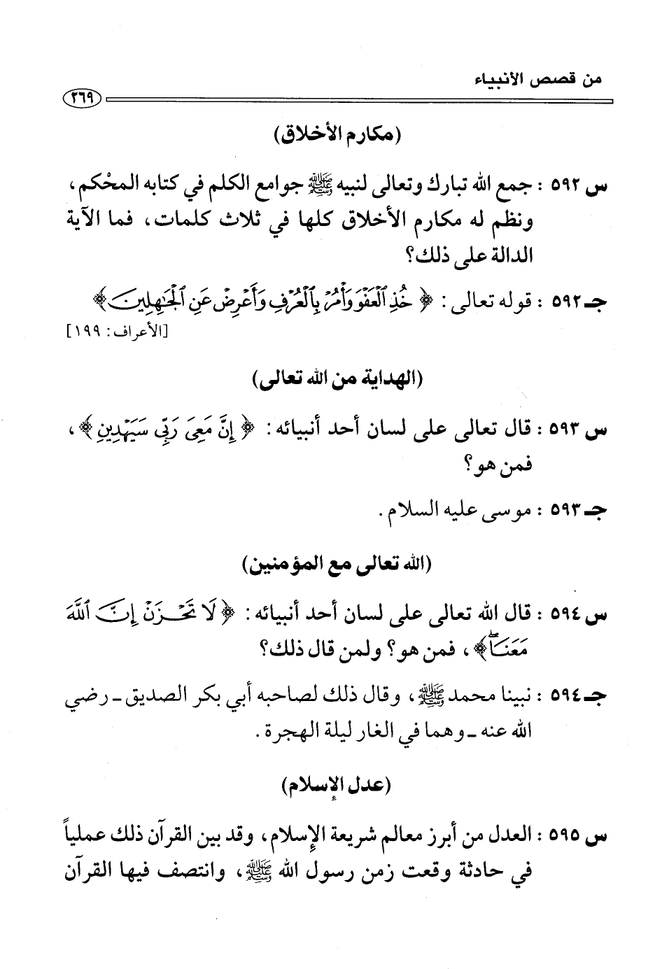 (س 592:) جمع الله تبارك وتعالى لنبيه صلّى الله عليه وسلّم جوامع الكلم في كتابه المحكم، ونظم له مكارم الأخلاق كلها في ثلاث كلمات، فما الآية الدالة على ذلك؟