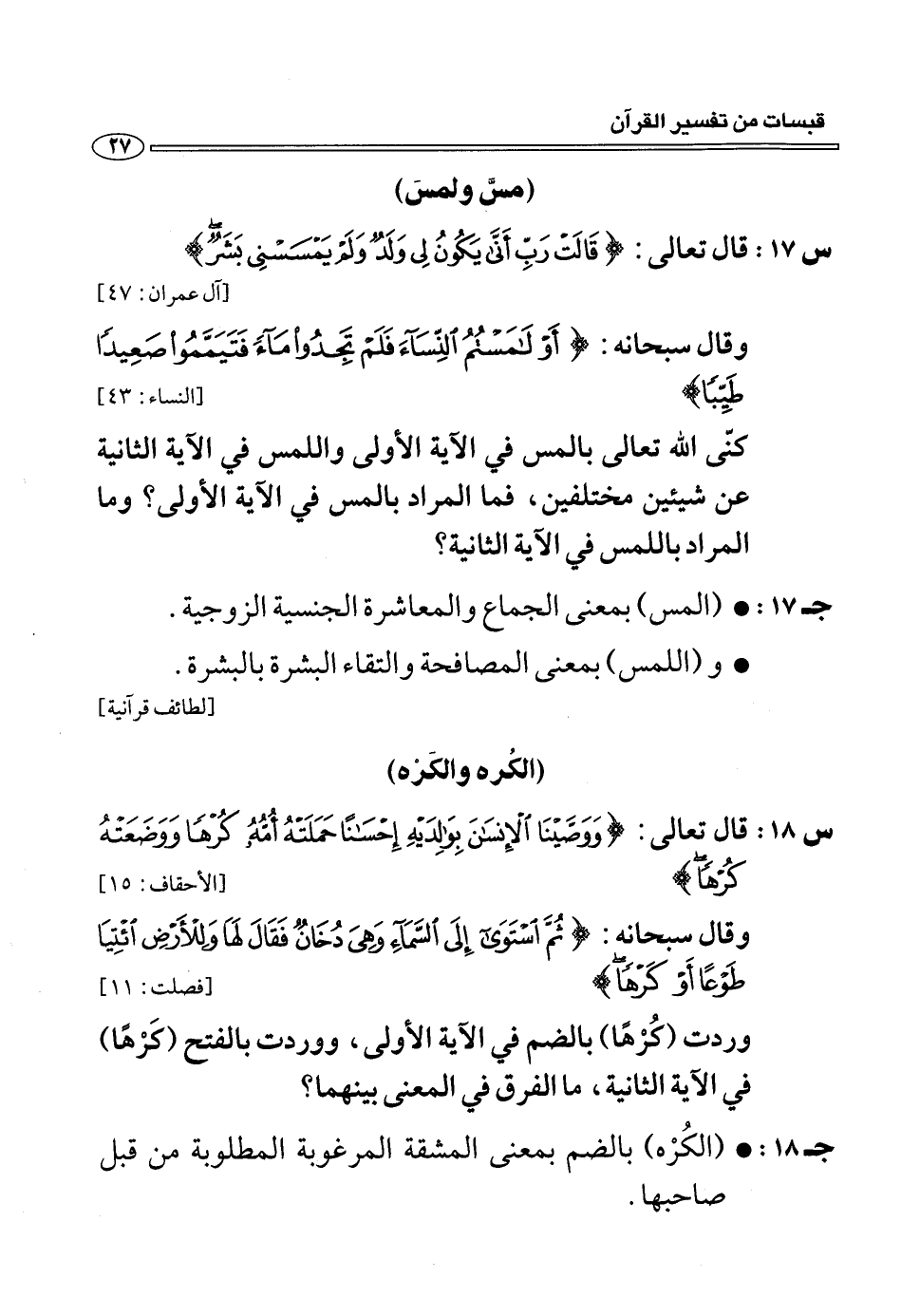 (س 17:) قال تعالى: قالَتْ رَبِّ أَنَّى يَكُونُ لِي وَلَدٌ وَلَمْ يَمْسَسْنِي بَشَرٌ [آل عمران: 47] وقال سبحانه: أَوْ لامَسْتُمُ النِّساءَ فَلَمْ تَجِدُوا ماءً فَتَيَمَّمُوا صَعِيداً طَيِّباً [النساء: 43] كنّى الله تعالى بالمس في الآية الأولى واللمس في الآية الثانية عن شيئين مختلفين، فما المراد بالمس في الآية الأولى؟ وما المراد باللمس في الآية الثانية؟