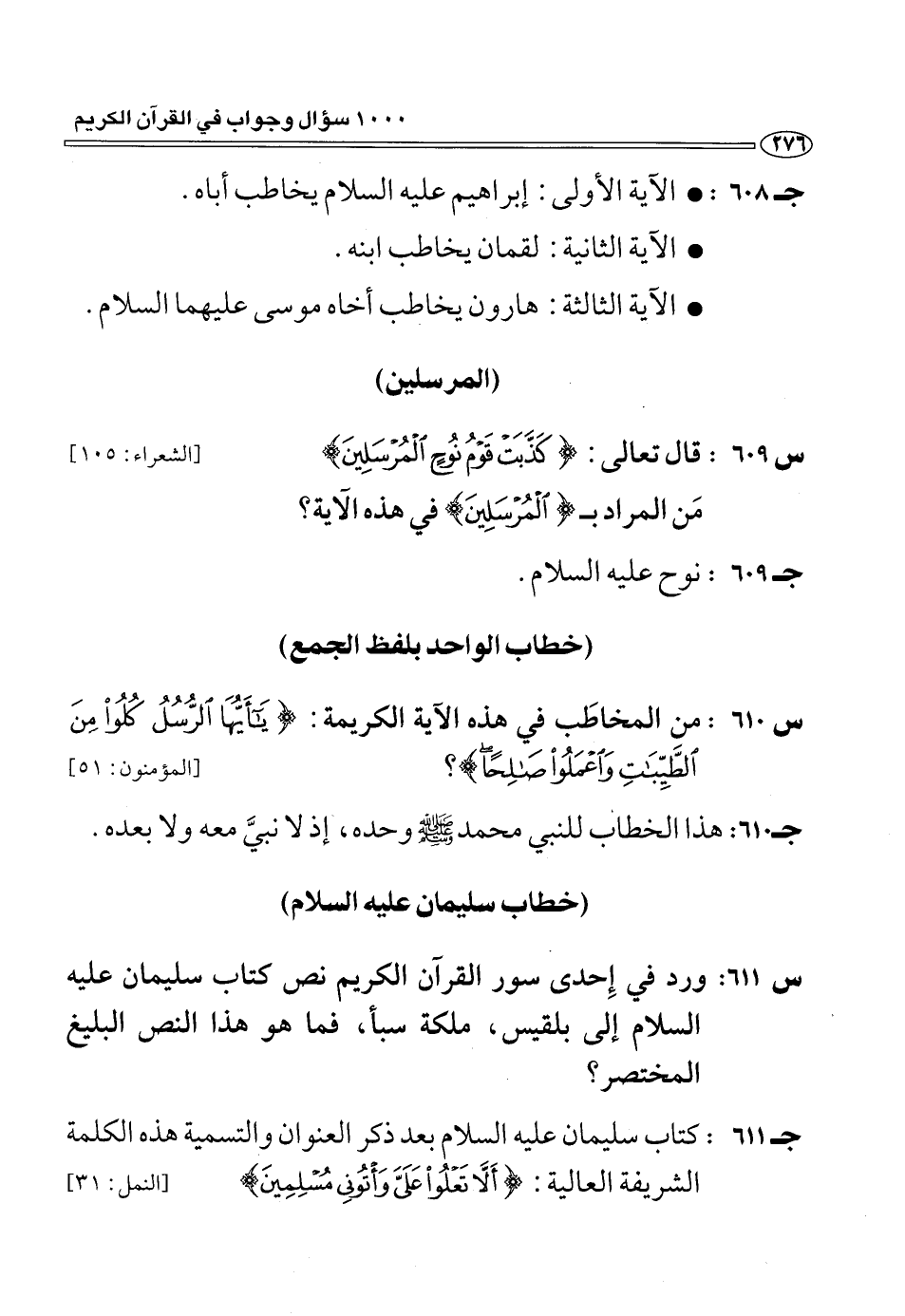 (س 610:) من المخاطب في هذه الآية الكريمة: يا أَيُّهَا الرُّسُلُ كُلُوا مِنَ الطَّيِّباتِ وَاعْمَلُوا صالِحاً؟ [المؤمنون: 51] (ج 610:) هذا الخطاب للنبي محمد صلّى الله عليه وسلّم وحده، إذ لا نبيّ معه ولا بعده.