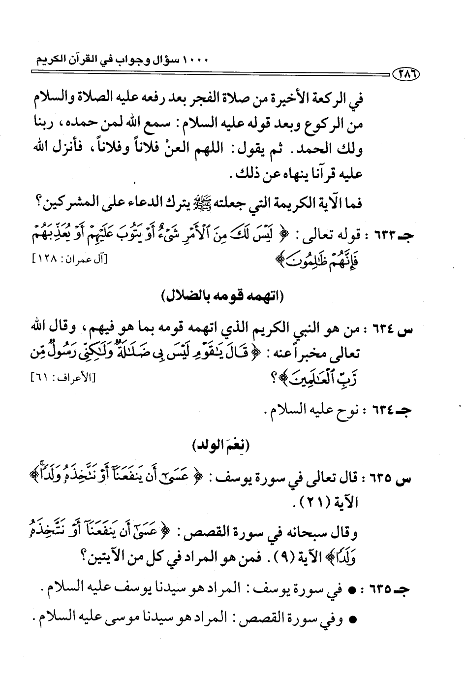 (س 634:) من هو النبي الكريم الذي اتهمه قومه بما هو فيهم، وقال الله تعالى مخبرا عنه: قالَ يا قَوْمِ لَيْسَ بِي ضَلالَةٌ وَلكِنِّي رَسُولٌ مِنْ رَبِّ الْعالَمِينَ؟ [الأعراف: 61] (ج 634:) نوح عليه السلام.