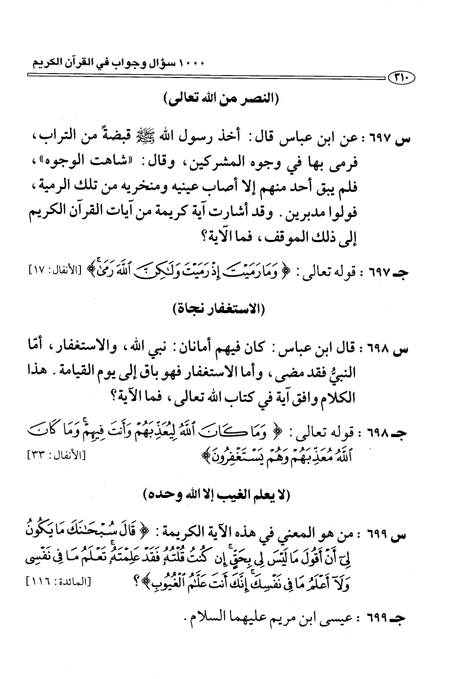 (س 699:) من هو المعنى في هذه الآية الكريمة: قالَ سُبْحانَكَ ما يَكُونُ لِي أَنْ أَقُولَ ما لَيْسَ لِي بِحَقٍّ إِنْ كُنْتُ قُلْتُهُ فَقَدْ عَلِمْتَهُ تَعْلَمُ ما فِي نَفْسِي وَلا أَعْلَمُ ما فِي نَفْسِكَ إِنَّكَ أَنْتَ عَلَّامُ الْغُيُوبِ؟ [المائدة: 116] (ج 699:) عيسى ابن مريم عليهما السلام.