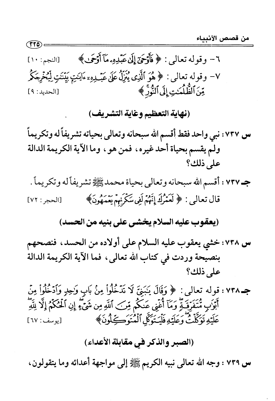 (س 738:) خشي يعقوب عليه السلام على أولاده من الحسد، فنصحهم بنصيحة وردت في كتاب الله تعالى، فما الآية الكريمة الدالة على ذلك؟