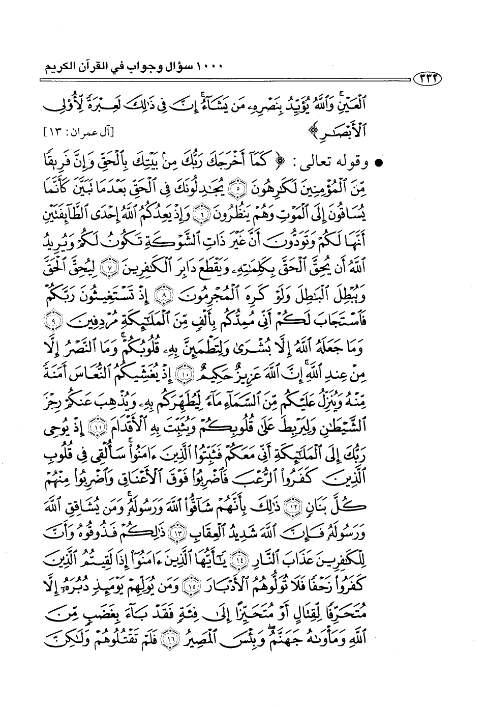الْعَيْنِ وَاللَّهُ يُؤَيِّدُ بِنَصْرِهِ مَنْ يَشاءُ إِنَّ فِي ذلِكَ لَعِبْرَةً لِأُولِي الْأَبْصارِ [آل عمران: 13] وقوله تعالى: كَما أَخْرَجَكَ رَبُّكَ مِنْ بَيْتِكَ بِالْحَقِّ وَإِنَّ فَرِيقاً مِنَ الْمُؤْمِنِينَ لَكارِهُونَ (5) يُجادِلُونَكَ فِي الْحَقِّ بَعْدَ ما تَبَيَّنَ كَأَنَّما يُساقُونَ إِلَى الْمَوْتِ وَهُمْ يَنْظُرُونَ (6) وَإِذْ يَعِدُكُمُ اللَّهُ إِحْدَى الطَّائِفَتَيْنِ أَنَّها لَكُمْ وَتَوَدُّونَ أَنَّ غَيْرَ ذاتِ الشَّوْكَةِ تَكُونُ لَكُمْ وَيُرِيدُ اللَّهُ أَنْ يُحِقَّ الْحَقَّ بِكَلِماتِهِ وَيَقْطَعَ دابِرَ الْكافِرِينَ (7) لِيُحِقَّ الْحَقَّ وَيُبْطِلَ الْباطِلَ وَلَوْ كَرِهَ الْمُجْرِمُونَ (8) إِذْ تَسْتَغِيثُونَ رَبَّكُمْ فَاسْتَجابَ لَكُمْ أَنِّي مُمِدُّكُمْ بِأَلْفٍ مِنَ الْمَلائِكَةِ مُرْدِفِينَ (9) وَما جَعَلَهُ اللَّهُ إِلَّا بُشْرى وَلِتَطْمَئِنَّ بِهِ قُلُوبُكُمْ وَمَا النَّصْرُ إِلَّا مِنْ عِنْدِ اللَّهِ إِنَّ اللَّهَ عَزِيزٌ حَكِيمٌ (10) إِذْ يُغَشِّيكُمُ النُّعاسَ أَمَنَةً مِنْهُ وَيُنَزِّلُ عَلَيْكُمْ مِنَ السَّماءِ ماءً لِيُطَهِّرَكُمْ بِهِ وَيُذْهِبَ عَنْكُمْ رِجْزَ الشَّيْطانِ وَلِيَرْبِطَ عَلى قُلُوبِكُمْ وَيُثَبِّتَ بِهِ الْأَقْدامَ (11) إِذْ يُوحِي رَبُّكَ إِلَى الْمَلائِكَةِ أَنِّي مَعَكُمْ فَثَبِّتُوا الَّذِينَ آمَنُوا سَأُلْقِي فِي قُلُوبِ الَّذِينَ كَفَرُوا الرُّعْبَ فَاضْرِبُوا فَوْقَ الْأَعْناقِ وَاضْرِبُوا مِنْهُمْ كُلَّ بَنانٍ (12) ذلِكَ بِأَنَّهُمْ شَاقُّوا اللَّهَ وَرَسُولَهُ وَمَنْ يُشاقِقِ اللَّهَ وَرَسُولَهُ فَإِنَّ اللَّهَ شَدِيدُ الْعِقابِ (13) ذلِكُمْ فَذُوقُوهُ وَأَنَّ لِلْكافِرِينَ عَذابَ النَّارِ (14) يا أَيُّهَا الَّذِينَ آمَنُوا إِذا لَقِيتُمُ الَّذِينَ كَفَرُوا زَحْفاً فَلا تُوَلُّوهُمُ الْأَدْبارَ (15) وَمَنْ يُوَلِّهِمْ يَوْمَئِذٍ دُبُرَهُ إِلَّا مُتَحَرِّفاً لِقِتالٍ أَوْ مُتَحَيِّزاً إِلى فِئَةٍ فَقَدْ باءَ بِغَضَبٍ مِنَ اللَّهِ وَمَأْواهُ جَهَنَّمُ وَبِئْسَ الْمَصِيرُ (16) فَلَمْ تَقْتُلُوهُمْ وَلكِنَ