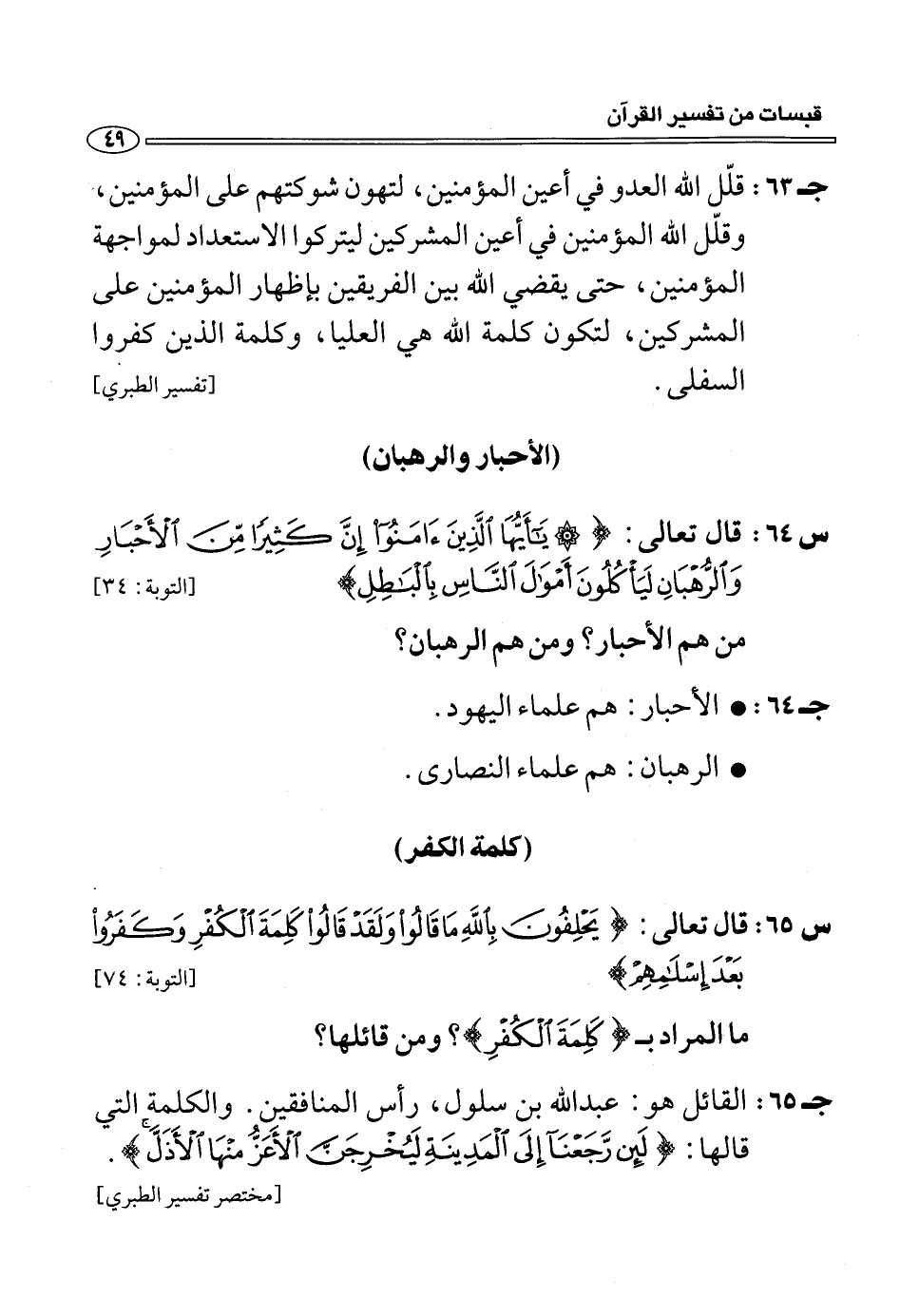 (س 64:) قال تعالى:* يا أَيُّهَا الَّذِينَ آمَنُوا إِنَّ كَثِيراً مِنَ الْأَحْبارِ وَالرُّهْبانِ لَيَأْكُلُونَ أَمْوالَ النَّاسِ بِالْباطِلِ [التوبة: 34] من هم الأحبار؟ ومن هم الرهبان؟