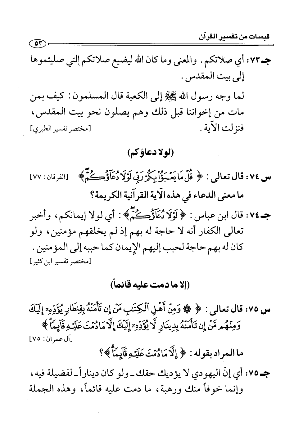 (س 75:) قال تعالى:* وَمِنْ أَهْلِ الْكِتابِ مَنْ إِنْ تَأْمَنْهُ بِقِنْطارٍ يُؤَدِّهِ إِلَيْكَ وَمِنْهُمْ مَنْ إِنْ تَأْمَنْهُ بِدِينارٍ لا يُؤَدِّهِ إِلَيْكَ إِلَّا ما دُمْتَ عَلَيْهِ قائِماً [آل عمران: 75] ما المراد بقوله: إِلَّا ما دُمْتَ عَلَيْهِ قائِماً؟