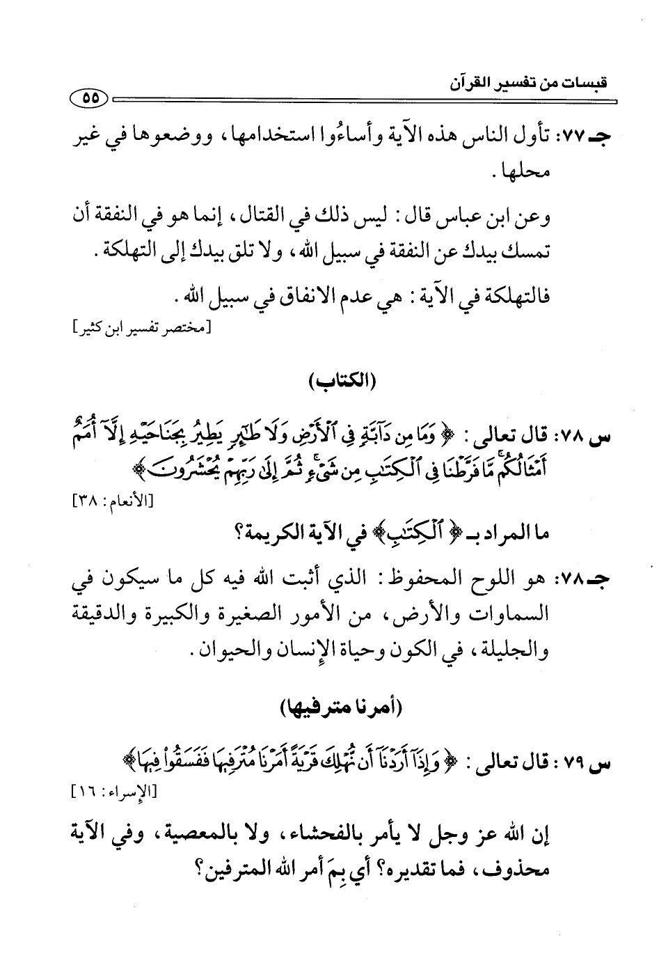 (س 79:) قال تعالى: وَإِذا أَرَدْنا أَنْ نُهْلِكَ قَرْيَةً أَمَرْنا مُتْرَفِيها فَفَسَقُوا فِيها [الإسراء: 16] إن الله عز وجل لا يأمر بالفحشاء، ولا بالمعصية، وفي الآية محذوف، فما تقديره؟ أي بم أمر الله المترفين؟