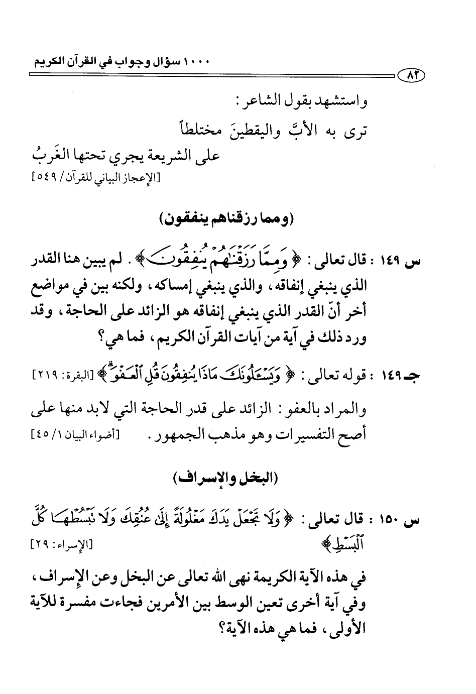 (س 149:) قال تعالى: وَمِمَّا رَزَقْناهُمْ يُنْفِقُونَ. لم يبين هنا القدر الذي ينبغي إنفاقه، والذي ينبغي إمساكه، ولكنه بين في مواضع أخر أنّ القدر الذي ينبغي إنفاقه هو الزائد على الحاجة، وقد ورد ذلك في آية من آيات القرآن الكريم، فما هي؟
