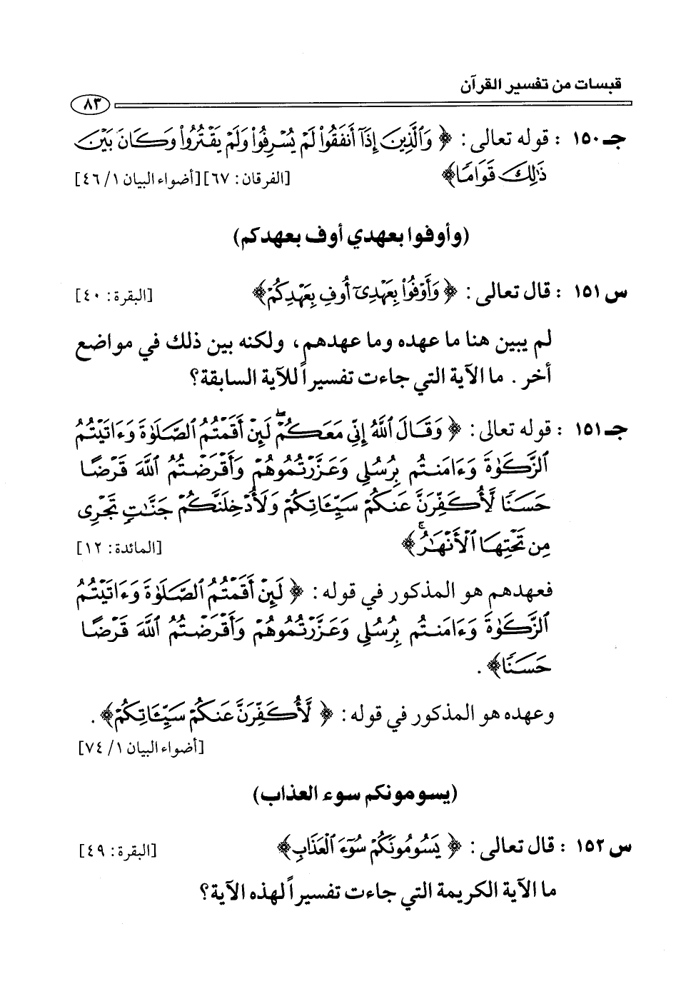 (ج 150:) قوله تعالى: وَالَّذِينَ إِذا أَنْفَقُوا لَمْ يُسْرِفُوا وَلَمْ يَقْتُرُوا وَكانَ بَيْنَ ذلِكَ قَواماً [الفرقان: 67] [أضواء البيان 1/ 46]