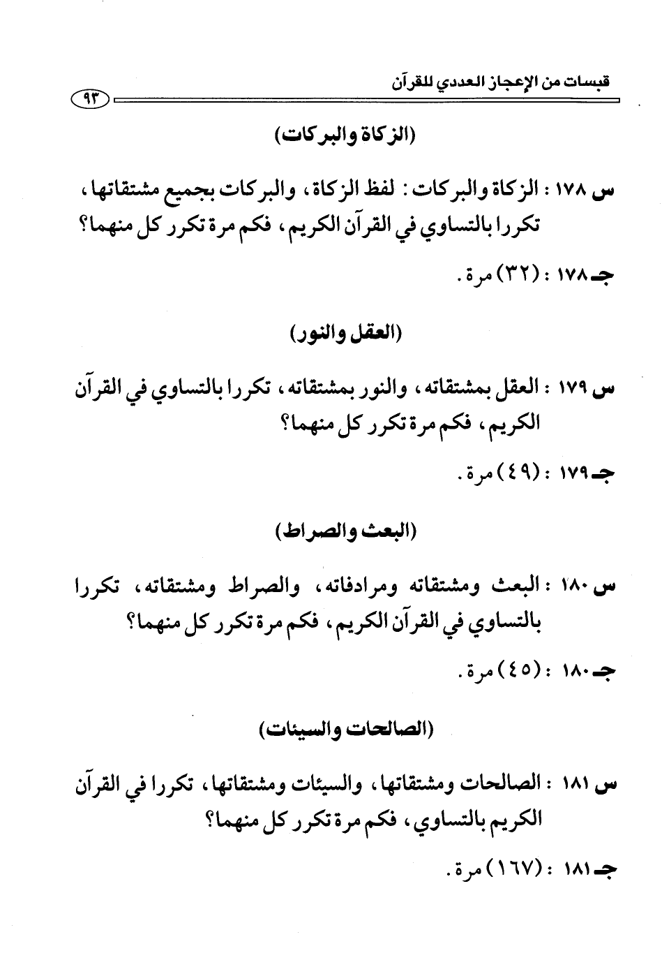 (س 180:) البعث ومشتقاته ومرادفاته، والصراط ومشتقاته، تكررا بالتساوي في القرآن الكريم، فكم مرة تكرر كل منهما؟