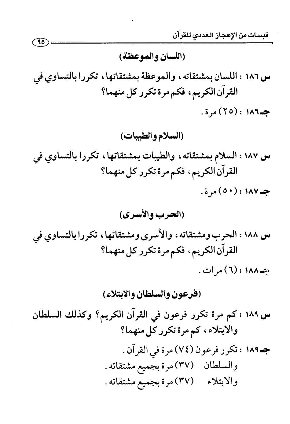 (س 187:) السلام بمشتقاته، والطيبات بمشتقاتها، تكررا بالتساوي في القرآن الكريم، فكم مرة تكرر كل منهما؟
