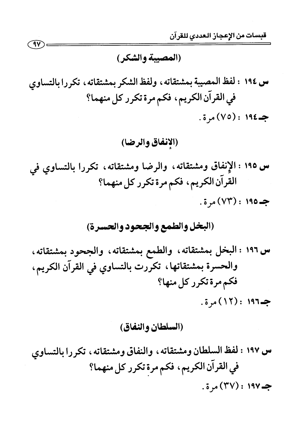 (س 196:) البخل بمشتقاته، والطمع بمشتقاته، والجحود بمشتقاته، والحسرة بمشتقاتها، تكررت بالتساوي في القرآن الكريم، فكم مرة تكرر كل منها؟