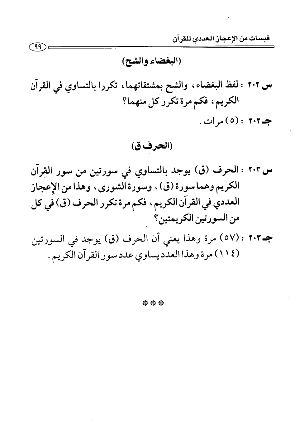 (ج 203:) (57) مرة وهذا يعني أن الحرف (ق) يوجد في السورتين (114) مرة وهذا العدد يساوي عدد سور القرآن الكريم.
