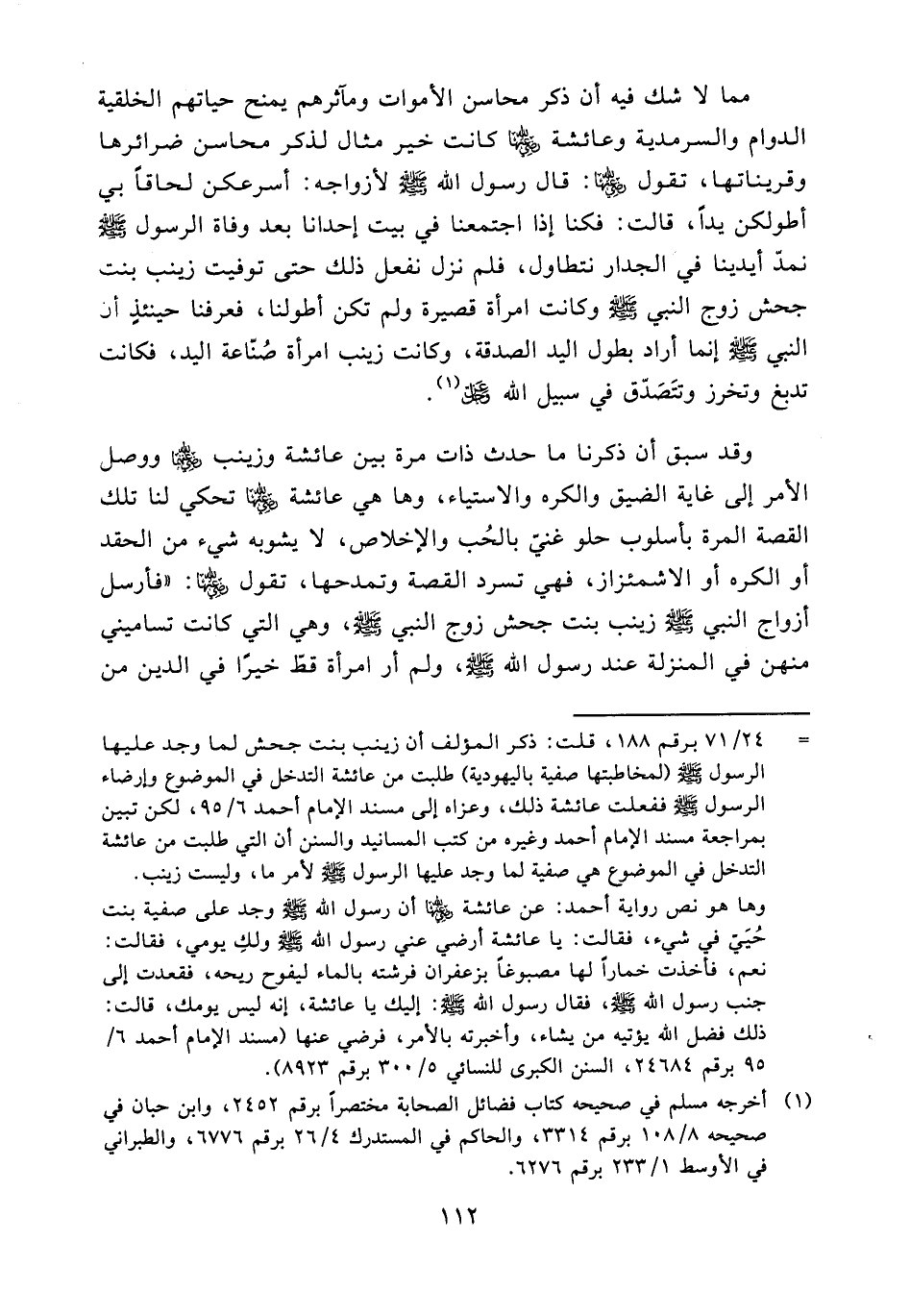 = 24/ 71 برقم 188، قلت: ذكر المؤلف أن زينب بنت جحش لما وجد عليها الرسول - صلى الله عليه وسلم - (لمخاطبتها صفية باليهودية) طلبت من عائشة التدخل في الموضوع وإرضاء الرسول - صلى الله عليه وسلم - ففعلت عائشة ذلك، وعزاه إلى مسند الإمام أحمد 6/ 95، لكن تبين بمراجعة مسند الإمام أحمد وغيره من كتب المسانيد والسنن أن التي طلبت من عائشة التدخل في الموضوع هي صفية لما وجد عليها الرسول - صلى الله عليه وسلم - لأمر ما، وليست زينب.