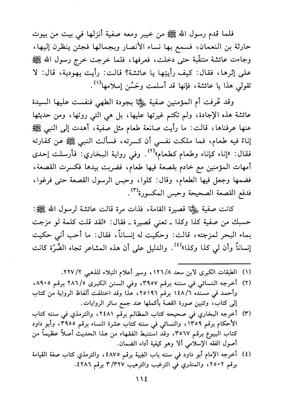فلما قدم رسول الله - صلى الله عليه وسلم - من خيبر ومعه صفية أنزلها في بيت من بيوت حارثة بن النعمان، فسمع بها نساء الأنصار وبجمالها فجئن ينظرن إليها، وجاءت عائشة متنقبة حتى دخلت، فعرفها، فلما خرجت خرج رسول الله - صلى الله عليه وسلم - على إثرها، فقال: كيف رأيتها يا عائشة؟ قالت: رأيت يهودية، قال: لا تقولي هذا يا عائشة، فإنها قد أسلمت وحسن إسلامها (¬1).