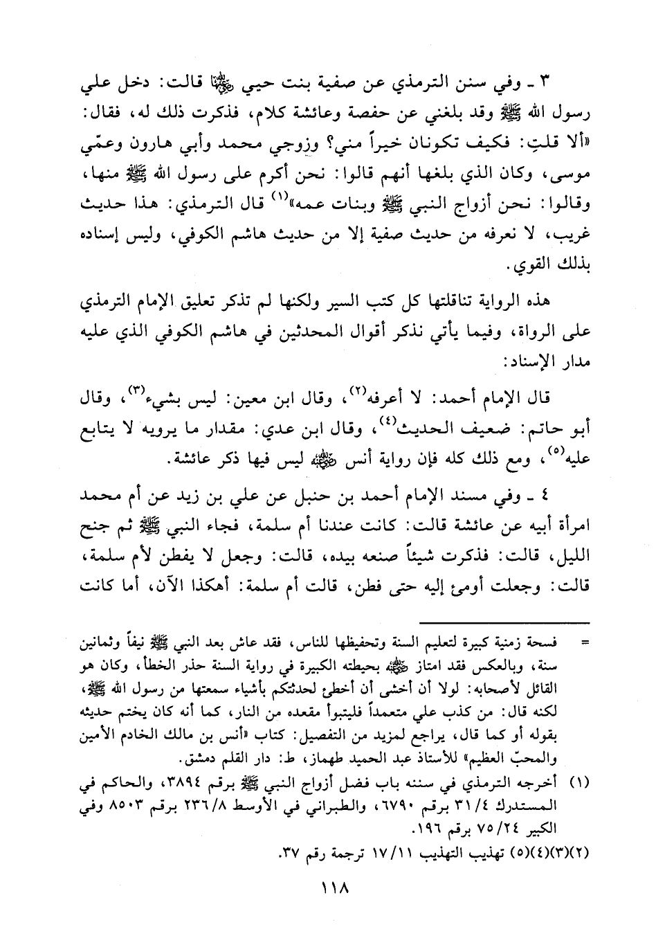3 - وفي سنن الترمذي عن صفية بنت حيي (ض) قالت: دخل علي رسول الله - صلى الله عليه وسلم - وقد بلغني عن حفصة وعائشة كلام، فذكرت ذلك له، فقال: ((ألا قلت: فكيف تكونان خيرا مني؟ وزوجي محمد وأبي هارون وعمي موسى، وكان الذي بلغها أنهم قالوا: نحن أكرم على رسول الله - صلى الله عليه وسلم - منها، وقالوا: نحن أزواج النبي - صلى الله عليه وسلم - وبنات عمه)) (¬1) قال الترمذي: هذا حديث غريب، لا نعرفه من حديث صفية إلا من حديث هاشم الكوفي، وليس إسناده بذلك القوي.
