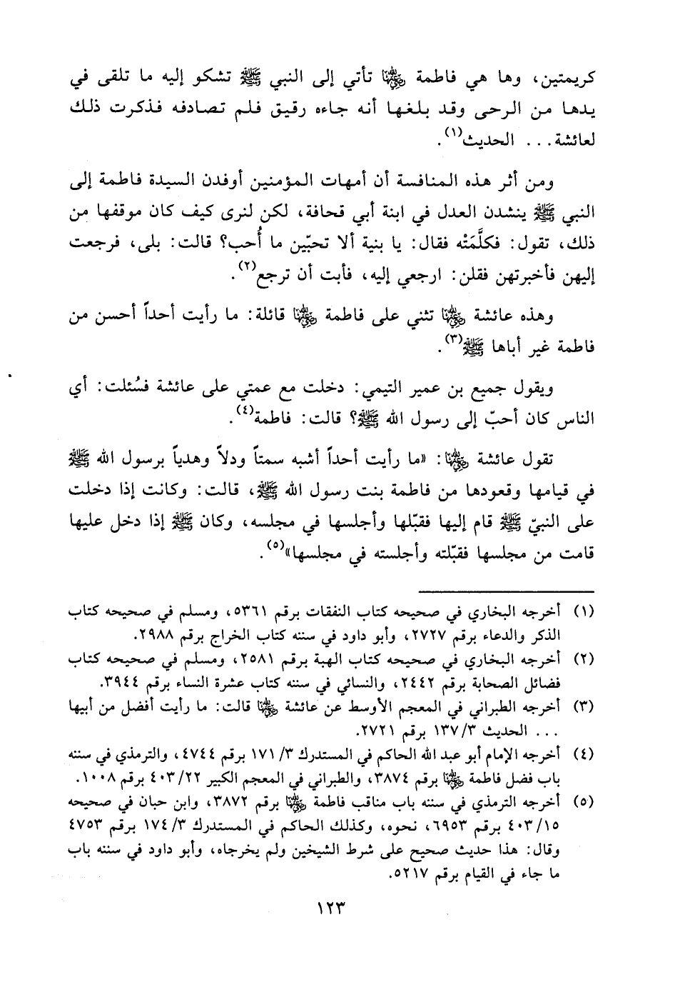 (¬5) أخرجه الترمذي في سننه باب مناقب فاطمة (ض) برقم 3872، وابن حبان في صحيحه 15/ 403 برقم 6953، نحوه، وكذلك الحاكم في المستدرك 174/ 3 برقم 4753 وقال: هذا حديث صحيح على شرط الشيخين ولم يخرجاه، وأبو داود في سننه باب ما جاء في القيام برقم 5217.