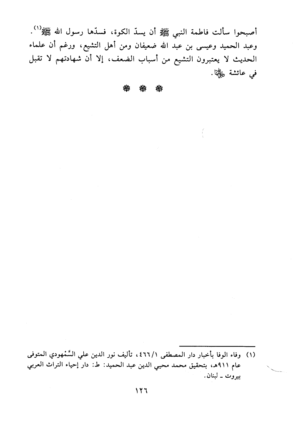 (¬1) وفاء الوفا بأخبار دار المصطفى 466/ 1، تأليف نور الدين علي السمهودي المتوفى عام 911هـ، بتحقيق محمد محيي الدين عبد الحميد: ط: دار إحياء التراث العربي بيروت- لبنان.