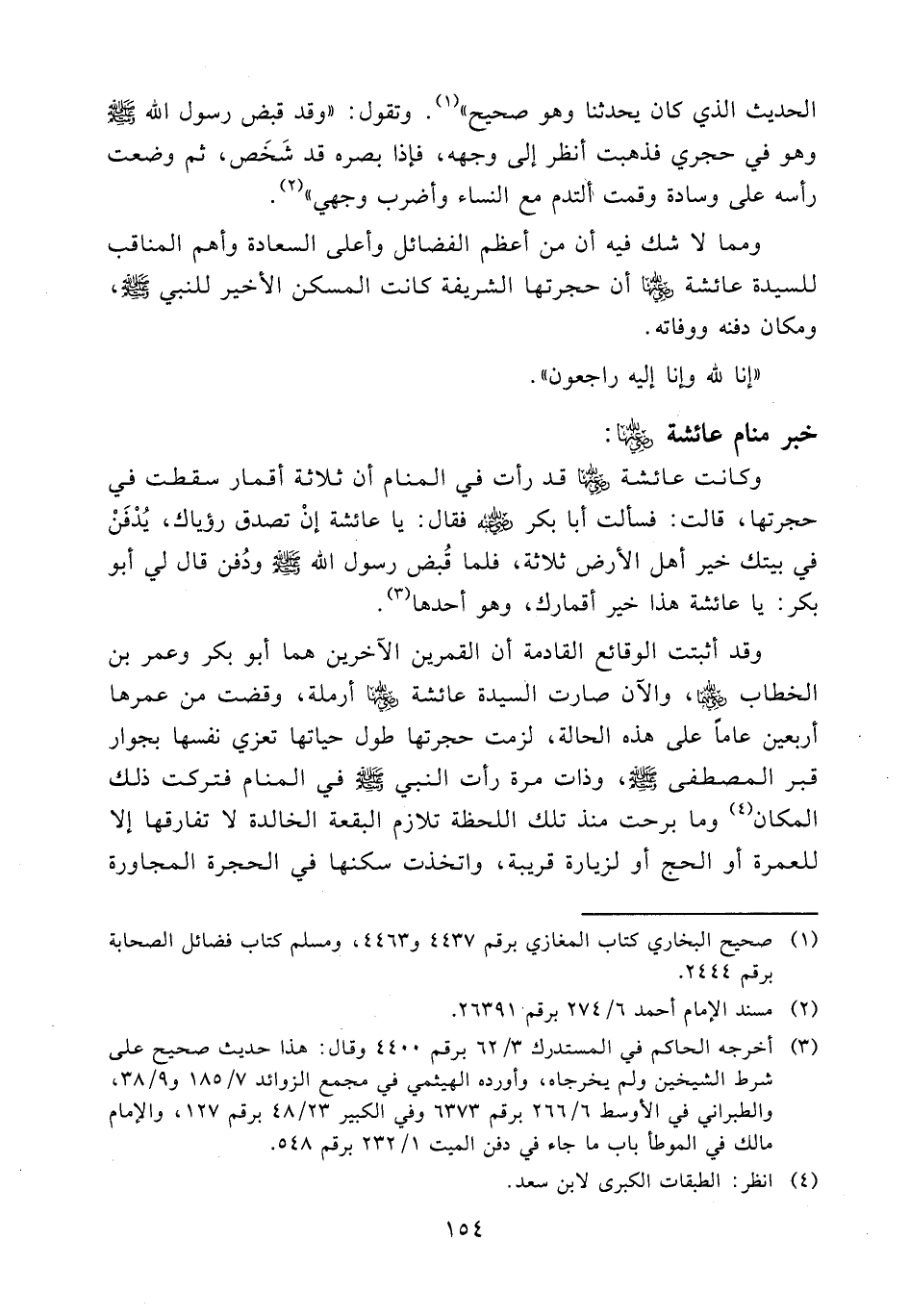 وقد أثبتت الوقائع القادمة أن القمرين الآخرين هما أبو بكر وعمر بن الخطاب (ض)، والآن صارت السيدة عائشة (ض) أرملة، وقضت من عمرها أربعين عاما على هذه الحالة، لزمت حجرتها طول حياتها تعزي نفسها بجوار قبر المصطفى - صلى الله عليه وسلم -، وذات مرة رأت النبي - صلى الله عليه وسلم - في المنام فتركت ذلك المكان (¬4) وما برحت منذ تلك اللحظة تلازم البقعة الخالدة لا تفارقها إلا للعمرة أو الحج أو لزيارة قريبة، واتخذت سكنها في الحجرة المجاورة