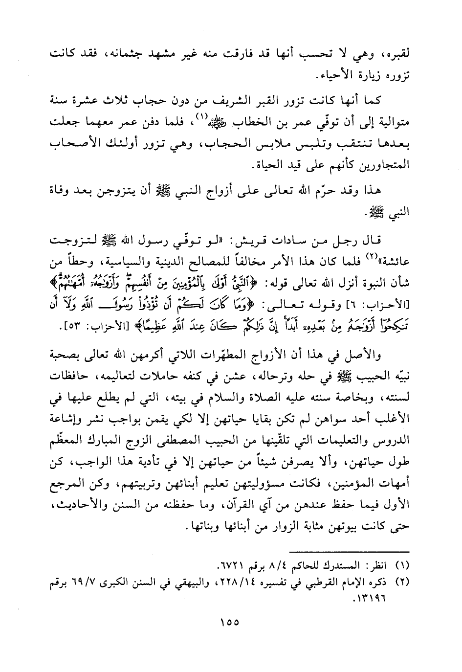 كما أنها كانت تزور القبر الشريف من دون حجاب ثلاث عشرة سنة متوالية إلى أن توفي عمر بن الخطاب (ض) (¬1)، فلما دفن عمر معهما جعلت بعدها تنتقب وتلبس ملابس الحجاب، وهي تزور أولئك الأصحاب المتجاورين كأنهم على قيد الحياة.