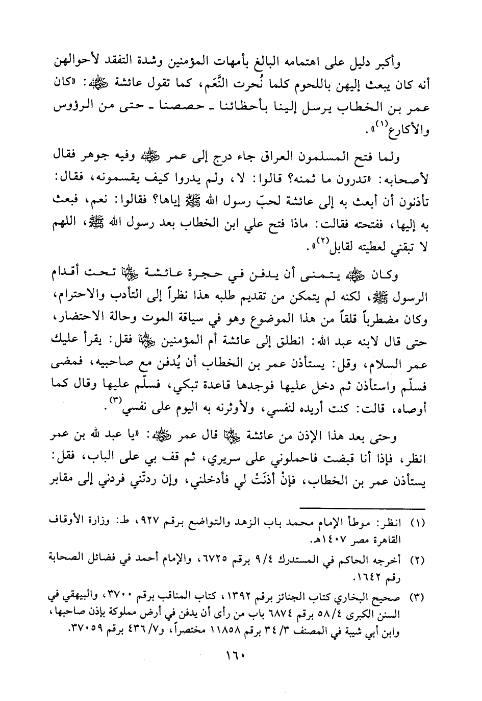 وأكبر دليل على اهتمامه البالغ بأمهات المؤمنين وشدة التفقد لأحوالهن أنه كان يبعث إليهن باللحوم كلما نحرت النعم، كما تقول عائشة (ض): ((كان عمر بن الخطاب يرسل إلينا بأحظائنا - حصصنا - حتى من الرؤوس والأكارع (¬1))).
