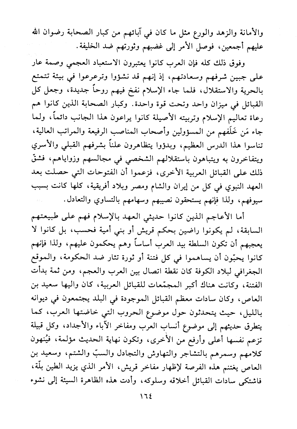 وفوق ذلك كله فإن العرب كانوا يعتبرون الاستعباد العجمي وصمة عار على جبين شرفهم وسعادتهم، إذ إنهم قد نشؤوا وترعرعوا في بيئة تتمتع بالحرية والاستقلال، فلما جاء الإسلام نفخ فيهم روحا جديدة، وجعل كل القبائل في ميزان واحد وتحت قوة واحدة. وكبار الصحابة الذين كانوا هم رعاة تعاليم الإسلام وتربيته الأصيلة كانوا يراعون هذا الجانب دائما، ولما جاء من حلفهم من المسؤولين وأصحاب المناصب الرفيعة والمراتب العالية، تناسوا هذا الدرس العظيم، وبدؤوا يتظاهرون علنا بشرفهم القبلي والأسرى ويتفاخرون به ويتباهون باستقلالهم الشيخصي في مجالسهم وزواياهم، فشق ذلك على القبائل العربية الأخرى، فزعموا أن الفتوحات التي حصلت بعد العهد النبوي في كل من إيران والشام ومصر وبلاد أفريقية، كلها كانت بسبب سيوفهم، ولذا بإنهم يستحقون نصيبهم وسهامهم بالتساري والتعادل.