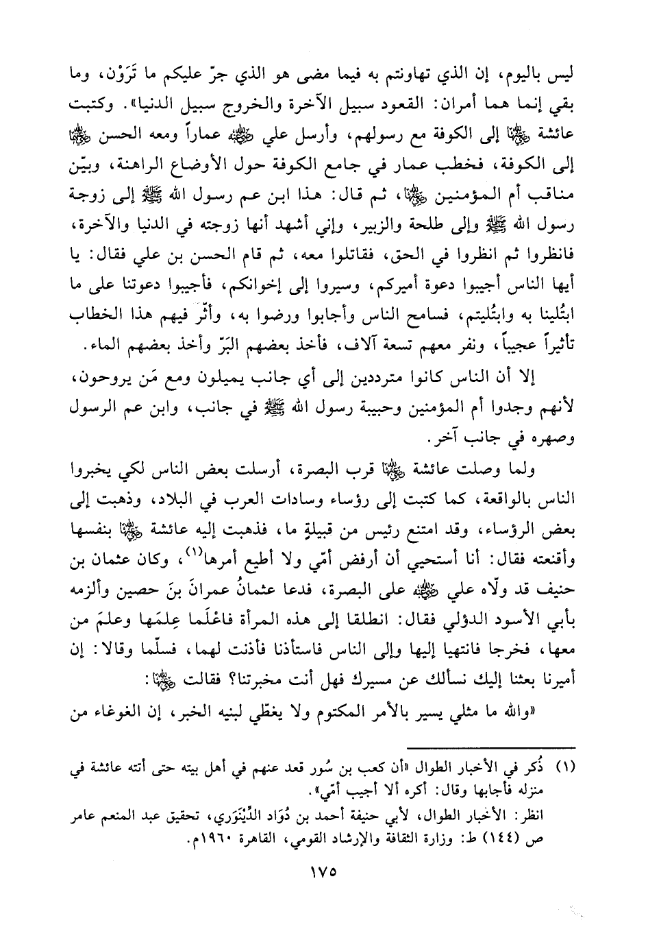 ليس باليوم، إن الذي تهاونتم به فيما مضى هو الذي جر عليكم ما ترون، وما بقي إنما هما أمران: القعود سبيل الآخرة والخروج سبيل الدنيا)). وكتبت عائشة (ض) إلى الكوفة مع رسولهم، وأرسل علي (ض) عمارا ومعه الحسن (ض) إلى الكوفة، فخطب عمار في جامع الكوفة حول الأوضاع الراهنة، وبين مناقب أم المؤمنين (ض)، ثم قال: هذا ابن عم رسول الله - صلى الله عليه وسلم - إلى زوجة رسول الله - صلى الله عليه وسلم - وإلى طلحة والزبير، وإني أشهد أنها زوجته في الدنيا والآخرة، فانظروا ثم انظروا في الحق، فقاتلوا معه، ثم قام الحسن بن علي فقال: ياأيها الناس أجيبوا دعوة أميركم، وسيروا إلى إخوانكم، فأجيبوا دعوتنا على ما ابتلينا به وابتليتم، فسامح الناس وأجابوا ورضوا به، وأثر فيهم هذا الخطاب تأثيرا عجيبا، ونفر معهم تسعة آلاف، فأخذ بعضهم البر وأخذ بعضهم الماء.