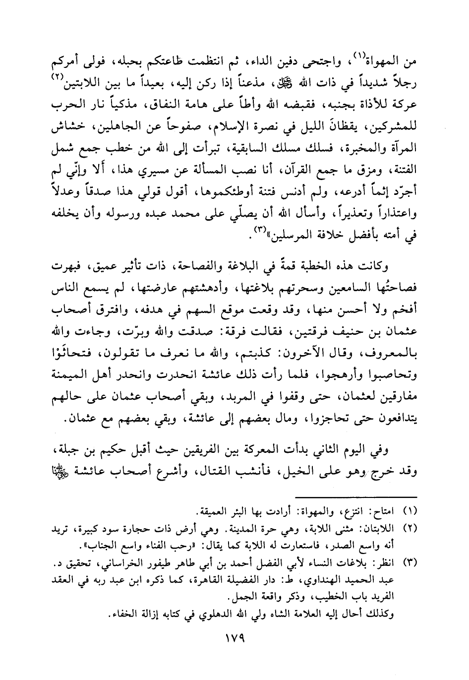 (¬3) انظر: بلاغات النساء لأبي الفضل أحمد بن أبي طاهر طيفور الخراساني، تحقيق د. عبد الحميد الهنداوي، ط: دار الفضيلة القاهرة، كما ذكره ابن عبد ربه في العقد الفريد باب الخطيب، وذكر واقعة الجمل. وكذلك أحال إليه العلامة الشاه ولي الله الدهلوي في كتابه إزالة الخفاء.