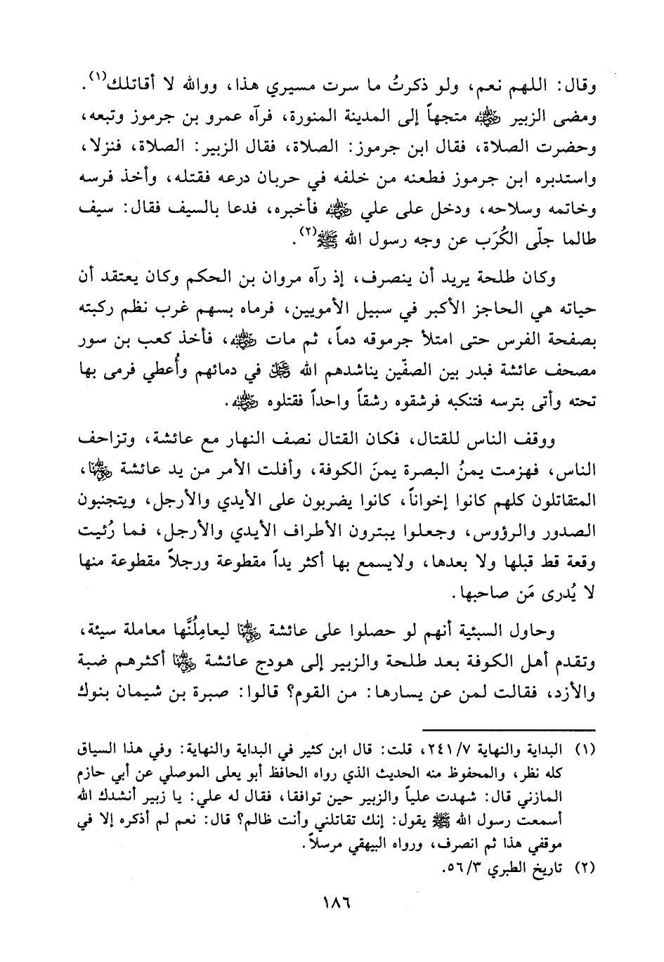 (¬1) البداية والنهاية 241/ 7، قلت: قال ابن كثير في البداية والنهاية: وفي هذا السياق كله نظر، والمحفوظ منه الحديث الذي رواه الحافظ أبو يعلى الموصلي عن أبي حازم المازني قال: شهدت عليا والزبير حين توافقا، فقال له علي: يا زبير أنشدك الله أسمعت رسول الله - صلى الله عليه وسلم - يقول: إنك تقاتلني وأنت ظالم؟ قال: نعم لم أذكره إلا في موقفي هذا ثم انصرف، ورواه البيهقي مرسلا.