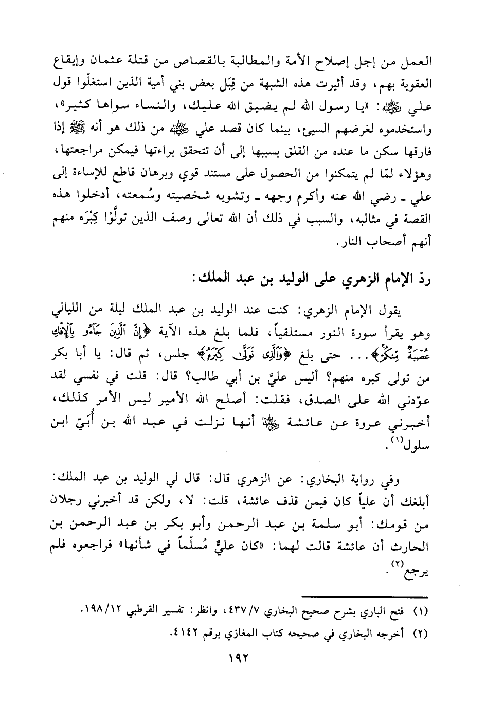 وفي رواية البخاري: عن الزهري قال: قال لي الوليد بن عبد الملك: أبلغك أن عليا كان فيمن قذف عائشة، قلت: لا، ولكن قد أخبرني رجلان من قومك: أبو سلمة بن عبد الرحمن وأبو بكر بن عبد الرحمن بن الحارث أن عائشة قالت لهما: ((كان علي مسلما في شأنها)) فراجعوه فلم يرجع (¬2).