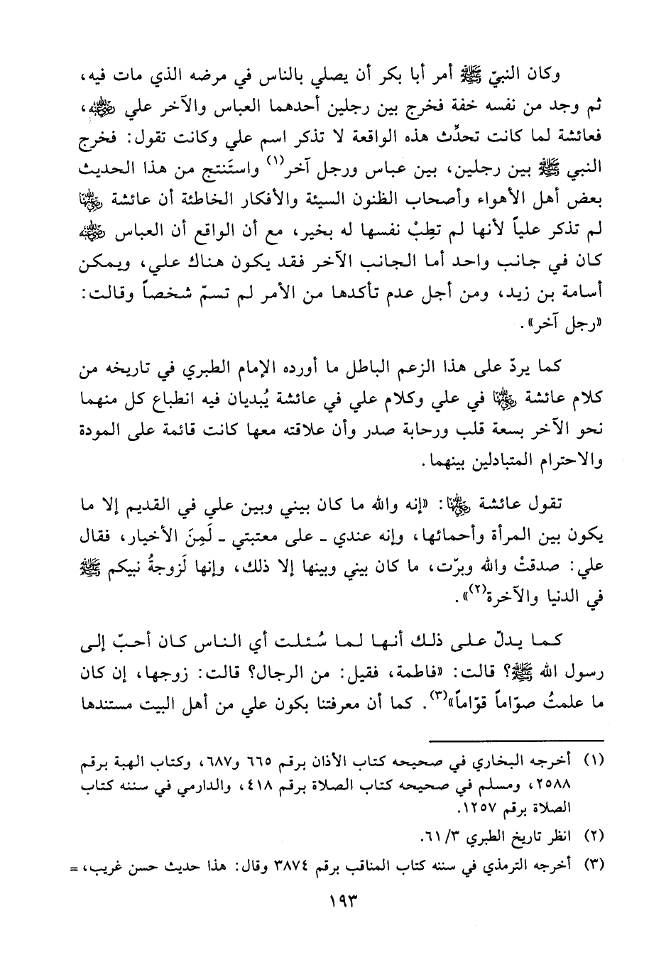 وكان النبي - صلى الله عليه وسلم - أمر أبا بكر أن يصلي بالناس في مرضه الذي مات فيه، ثم وجد من نفسه خفة فخرج بين رجلين أحدهما العباس والآخر علي (ض)، فعائشة لما كانت تحدث هذه الواقعة لا تذكر اسم علي وكانت تقول: فخرج النبي - صلى الله عليه وسلم - بين رجلين، بين عباس ورجل آخر (¬1) واستنتج من هذا الحديث بعض أهل الأهواء وأصحاب الظنون السيئة والأفكار الخاطئة أن عائشة (ض) لم تذكر عليا لأنها لم تطب نفسها له بخير، مع أن الواقع أن العباس (ض) كان في جانب واحد أما الجانب الآخر فقد يكون هناك علي، ويمكن أسامة بن زيد، ومن أجل عدم تأكدها من الأمر لم تسم شخصا وقالت: ((رجل آخر)).