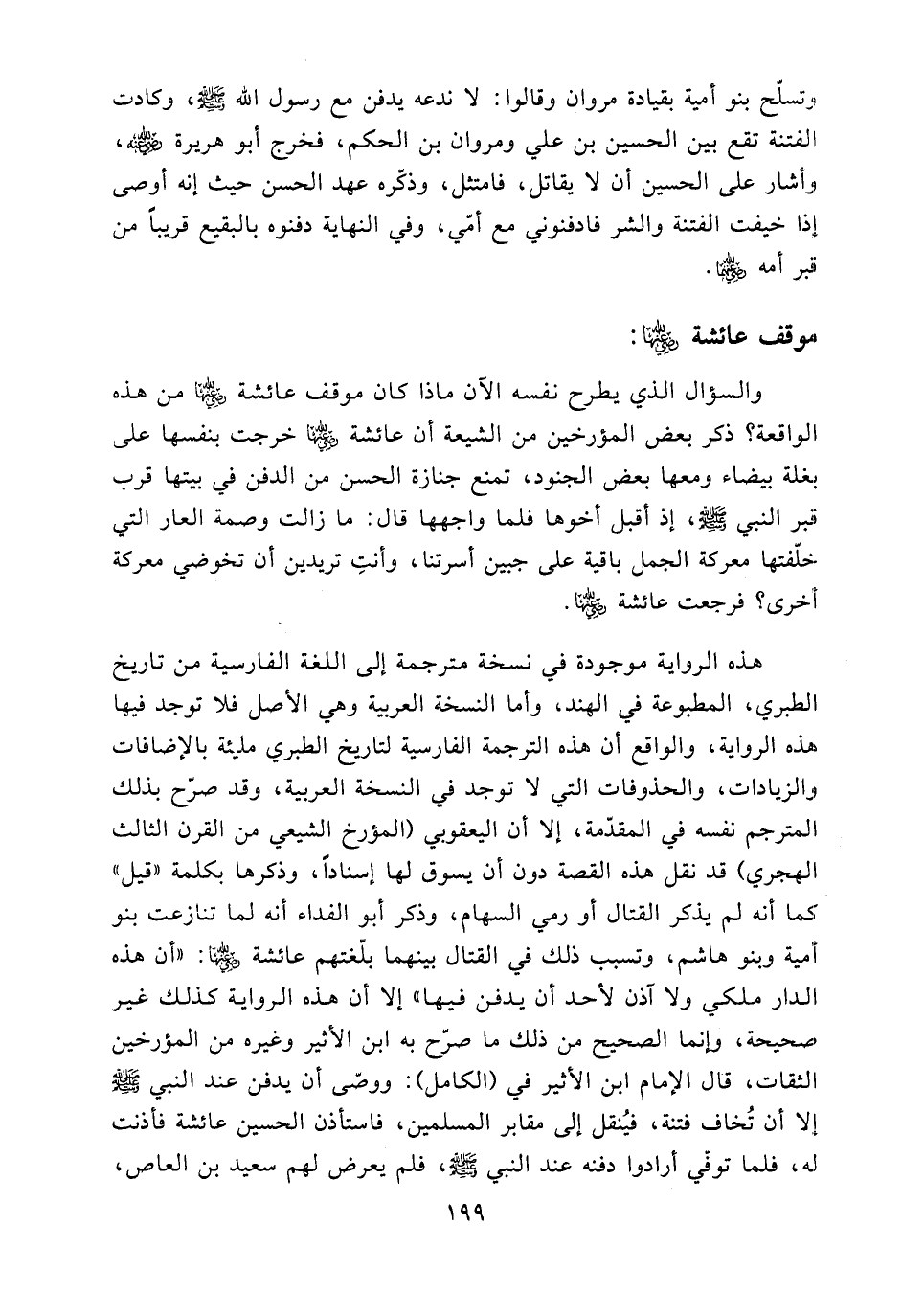 هذه الرواية موجودة في نسخة مترجمة إلى اللغة الفارسية من تاريخ الطبري، المطبوعة في الهند، وأما النسخة العربية وهي الأصل فلا توجد فيها هذه الرواية، والواقع أن هذه الترجمة الفارسية لتاريخ الطبري مليئة بالإضافات والزيادات، والحذوفات التي لا توجد في النسخة العربية، وقد صرح بذلك المترجم نفسه في المقدمة، إلا أن اليعقوبي (المؤرخ الشيعي من القرن الثالث الهجري) قد نقل هذه القصة دون أن يسوق لها إسنادا، وذكرها بكلمة ((قيل)) كما أنه لم يذكر القتال أو رمي السهام، وذكر أبو الفداء أنه لما تنازعت بنو أمية وبنو هاشم، وتسبب ذلك في القتال بينهما بلغتهم عائشة (ض): ((أن هذه الدار ملكي ولا آذن لأحد أن يدفن فيها)) إلا أن هذه الرواية كذلك غير صحيحة، وإنما الصحيح من ذلك ما صرح به ابن الأثير وغيره من المؤرخين الثقات، قال الإمام ابن الأثير في (الكامل): ووصى أن يدفن عند النبي - صلى الله عليه وسلم - إلا أن تخاف فتنة، فينقل إلى مقابر المسلمين، فاستأذن الحسين عائشة فأذنت له، فلما توفي أرادوا دفنه عند النبي - صلى الله عليه وسلم -، فلم يعرض لهم سعيد بن العاص،