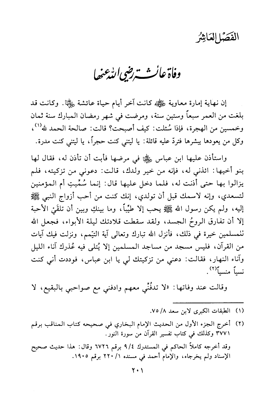 واستأذن عليها ابن عباس (ض) في مرضها فأبت أن تأذن له، فقال لها بنو أخيها: ائذني له، فإنه من خير ولدك، قالت: دعوني من تزكيته، فلم يزالوا بها حتى أذنت له، فلما دخل عليها قال: إنما سميت أم المؤمنين لتسعدي، وإنه لاسمك قبل أن تولدي، إنك كنت من أحب أزواج النبي - صلى الله عليه وسلم - إليه، ولم يكن رسول الله - صلى الله عليه وسلم - يحب إلا طيبا، وما بينك وبين أن تلقي الأحبة إلا أن تفارق الروح الجسد، ولقد سقطت قلادتك ليلة الأبواء، فجعل الله للمسلمين خيرة في ذلك، فأنزل الله تبارك وتعالى آية التيمم، ونزلت فيك آيات من القرآن، فليس مسجد من مساجد المسلمين إلا يتلى فيه عذرك آناء الليل وآناء النهار، فقالت: دعني من تزكيتك لي يا ابن عباس، فوددت أني كنت نسيا منسيا (¬2).