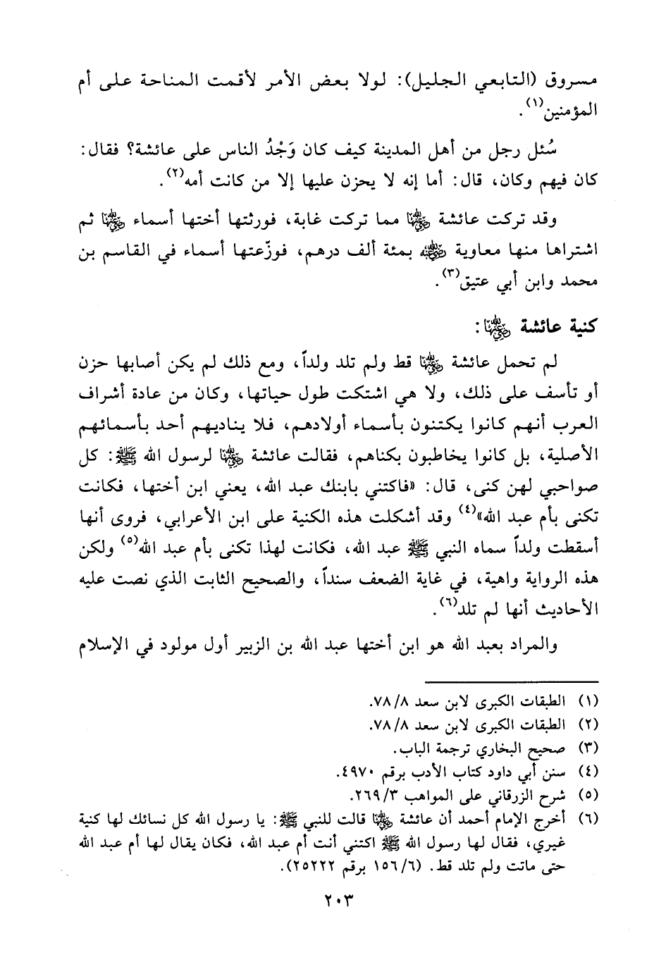 (¬6) أخرج الإمام أحمد أن عائشة (ض) قالت للنبي - صلى الله عليه وسلم - يا رسول الله كل نسائك لها كنية غيري، فقال لها رسول الله - صلى الله عليه وسلم - اكتني أنت أم عبد الله، فكان يقال لها أم عبد الله حتى ماتت ولم تلد قط. (6/ 156 برقم 25222).