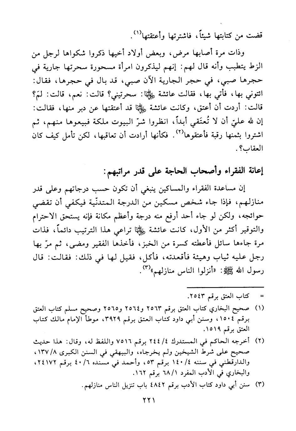 إن مساعدة الفقراء والمساكين ينبغي أن تكون حسب درجاتهم وعلى قدر منازلهم، فإذا جاء شخص مسكين من الدرجة المتدنية فيكفي أن تقضي حوائجه، ولكن لو جاء أحد أرفع منه درجة وأعظم مكانة فإنه يستحق الاحترام والتوقير أكثر من الأول، كانت عائشة (ض) تراعي هذا الترتيب دائما، فذات مرة جاءها سائل فأعطته كسرة من الخبز، فأخذها الفقير ومضى، ثم مر بها رجل عليه ثياب وهيئة فأقعدته، فأكل، فقيل لها في ذلك: فقالت: قال رسول الله - صلى الله عليه وسلم -: ((أنزلوا الناس منازلهم)) (¬3).