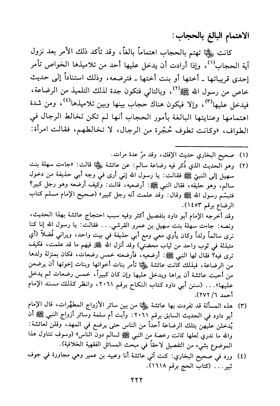(¬3) هذه المسألة قد تفردت بها عائشة (ض) من بين سائر الأزواج المطهرات، قال الإمام أبو داود في الحديث السابق برقم 2061: وأبت أم سلمة وسائر أزواج النبي - صلى الله عليه وسلم - أن يدخلن عليهن بتلك الرضاعة أحدا من الناس حتى يرضع في المهد، وقلن لعائشة: