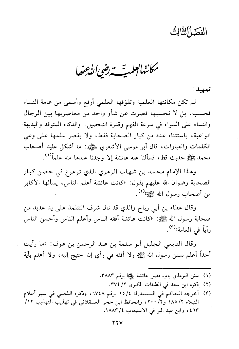 وهذا الإمام محمد بن شهاب الزهري الذي ترعرع في حضن كبار الصحابة رضوان الله عليهم يقول: ((كانت عائشة أعلم الناس، يسألها الأكابر من أصحاب رسول الله - صلى الله عليه وسلم -)) (¬2).