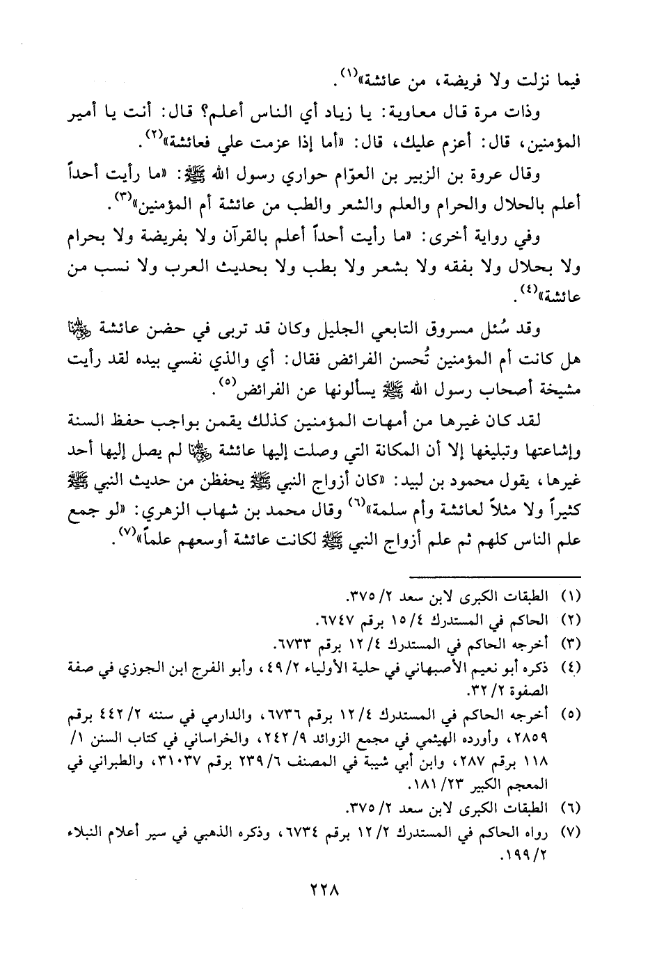 وقد سئل مسروق التابعي الجليل وكان قد تربى في حضن عائشة (ض) هل كانت أم المؤمنين تحسن الفرائض فقال: أي والذي نفسي بيده لقد رأيت مشيخة أصحاب رسول الله - صلى الله عليه وسلم - يسألونها عن الفرائض (¬5).