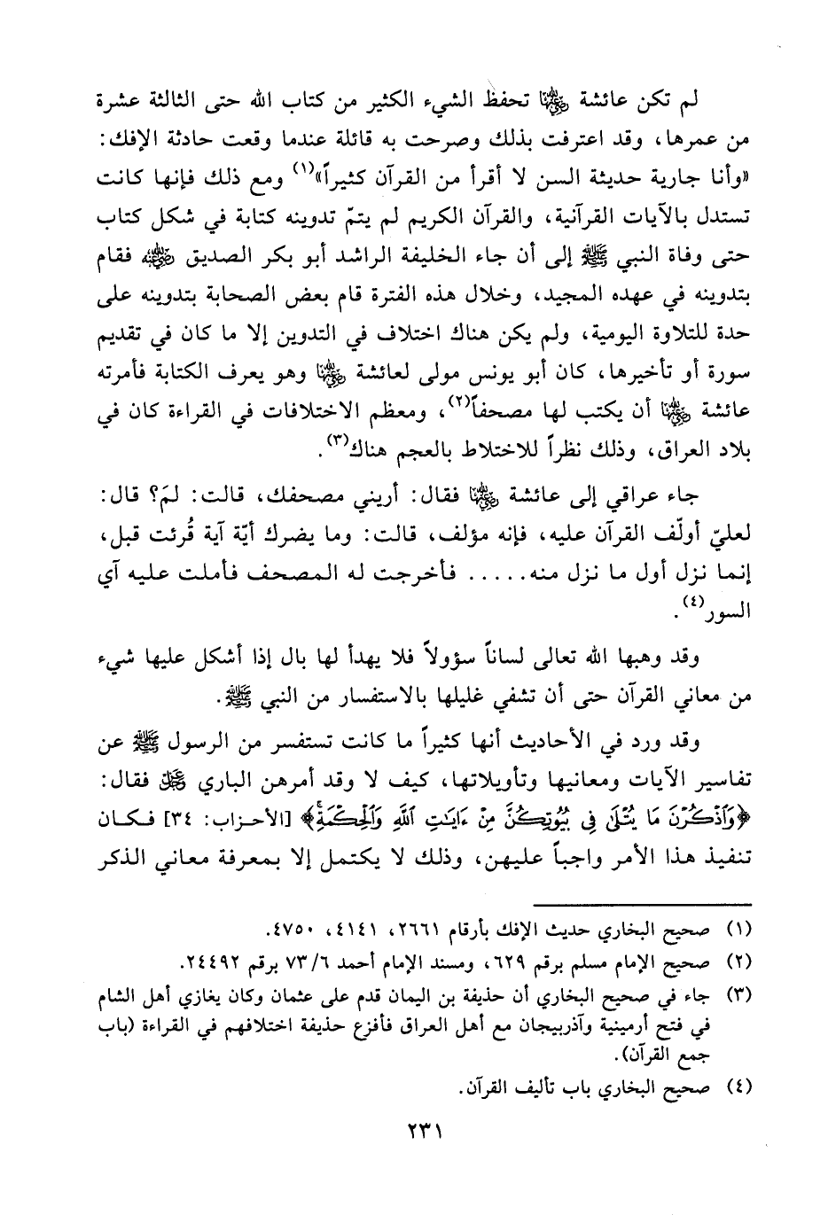 لم تكن عائشة (ض) تحفظ الشيء الكثير من كتاب الله حتى الثالثة عشرة من عمرها، وقد اعترفت بذلك وصرحت به قائلة عندما وقعت حادثة الإفك: ((وأنا جارية حديثة السن لا أقرأ من القرآن كثيرا)) (¬1) ومع ذلك فإنها كانت تستدل بالآيات القرآنية، والقرآن الكريم لم يتم تدوينه كتابة في شكل كتاب حتى وفاة النبي - صلى الله عليه وسلم - إلى أن جاء الخليفة الراشد أبو بكر الصديق (ض) فقام بتدوينه في عهده المجيد، وخلال هذه الفترة قام بعض الصحابة بتدوينه على حدة للتلاوة اليومية، ولم يكن هناك اختلاف في التدوين إلا ما كان في تقديم سورة أو تأخيرها، كان أبو يونس مولى لعائشة (ض) وهو يعرف الكتابة فأمرته عائشة (ض) أن يكتب لها مصحفا (¬2)، ومعظم الاختلافات في القراءة كان في بلاد العراق، وذلك نظرا للاختلاط بالعجم هناك (¬3).