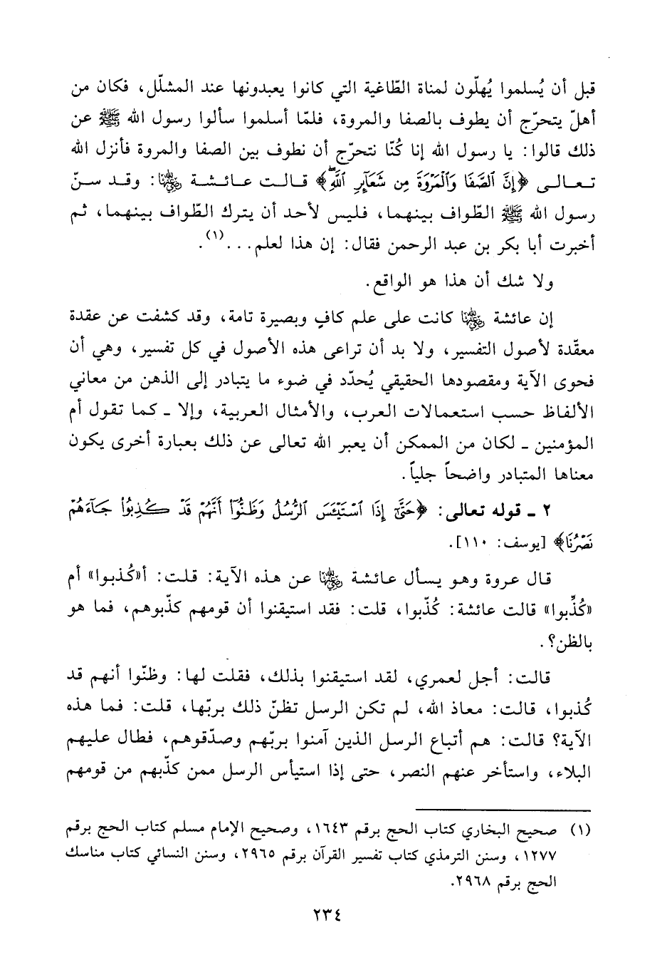 قال عروة وهو يسأل عائشة (ض) عن هذه الآية: قلت: أ ((كذبوا)) أم ((كذبوا)) قالت عائشة: كذبوا، قلت: فقد استيقنوا أن قومهم كذبوهم، فما هو بالظن؟.