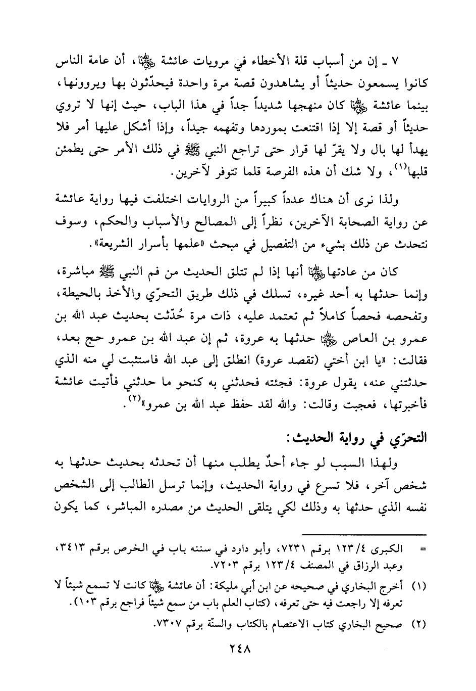 كان من عادتها (ض) أنها إذا لم تلق الحديث من فم النبي - صلى الله عليه وسلم - مباشرة، وإنما حدثها به أحد غيره، تسلك في ذلك طريق التحري والأخذ بالحيطة، وتفحصه فحصا كاملا ثم تعتمد عليه، ذات مرة خدثت بحديث عبد الله بن عمرو بن العاص. حدثها به عروة، ثم إن عبد الله بن عمرو حج بعد، فقالت: ((يا ابن أختي (تقصد عروة) انطلق إلى عبد الله فاستثبت لي منه الذي حدثتني عنه، يقول عروة: فجئته فحدثني به كنحو ما حدثني فأتيت عائشة فأخبرتها، فعجبت وقالت: والله لقد حفظ عبد الله بن عمرو)) (¬2).