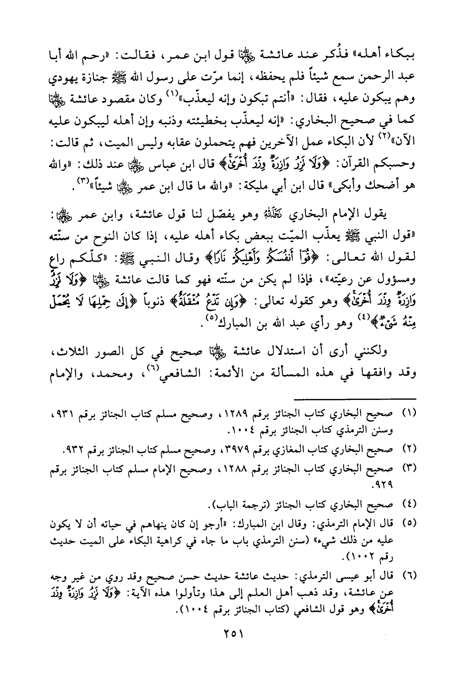 (¬6) قال أبو عيسى الترمذي: حديث عائشة حديث حسن صحيح وقد روي من غير وجه عن عائشة، وقد ذهب أهل العلم إلى هذا وتأولوا هذه الآية: {وَلَا تَزِرُ وَازِرَةٌ وِزْرَ أُخْرَى} وهو قول الشافعي (كتاب الجنائز برقم 1004).