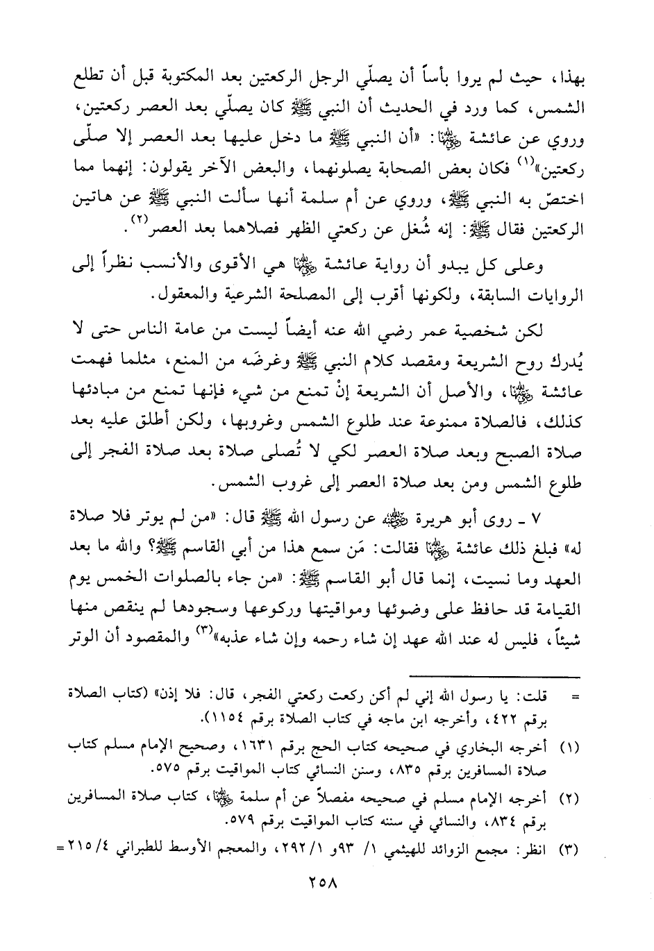 بهذا، حيث لم يروا بأسا أن يصلي الرجل الركعتين بعد المكتوبة قبل أن تطلع الشمس، كما ورد في الحديث أن النبي - صلى الله عليه وسلم - كان يصلي بعد العصر ركعتين، وروي عن عائشة (ض): ((أن النبي - صلى الله عليه وسلم - ما دخل عليها بعد العصر إلا صلى ركعتين)) (¬1) فكان بعض الصحابة يصلونهما، والبعض الآخر يقولون: إنهما مما اختص به النبي - صلى الله عليه وسلم -، وروي عن أم سلمة أنها سألت النبي - صلى الله عليه وسلم - عن هاتين الركعتتن فقال - صلى الله عليه وسلم -: إنه شغل عن ركعتي الظهر فصلاهما بعد العصر (¬2).