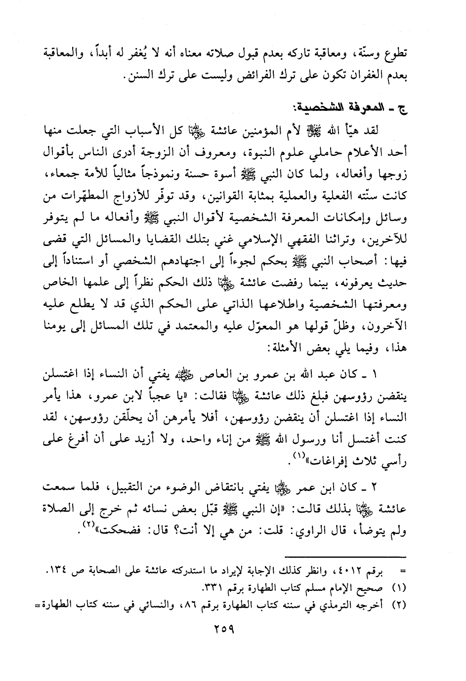 = برقم 4012، وانظر كذلك الإجابة لإيراد ما استدركته عائشة على الصحابة ص 134. (1) صحيح الإمام مسلم كتاب الطهارة رقم 331.