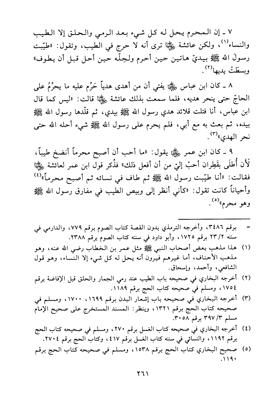 7 - إن المحرم يحل له كل شيء بعد الرمي والحلق إلا الطيب والنساء (¬1)، ولكن عائشة (ض) ترى أنه لا حرج في الطيب، وتقول: ((طيبت رسول الله - صلى الله عليه وسلم - بيدي هاتين حين أحرم ولحله حين أحل قبل أن يطوف)) وبسطت يديها (¬2).