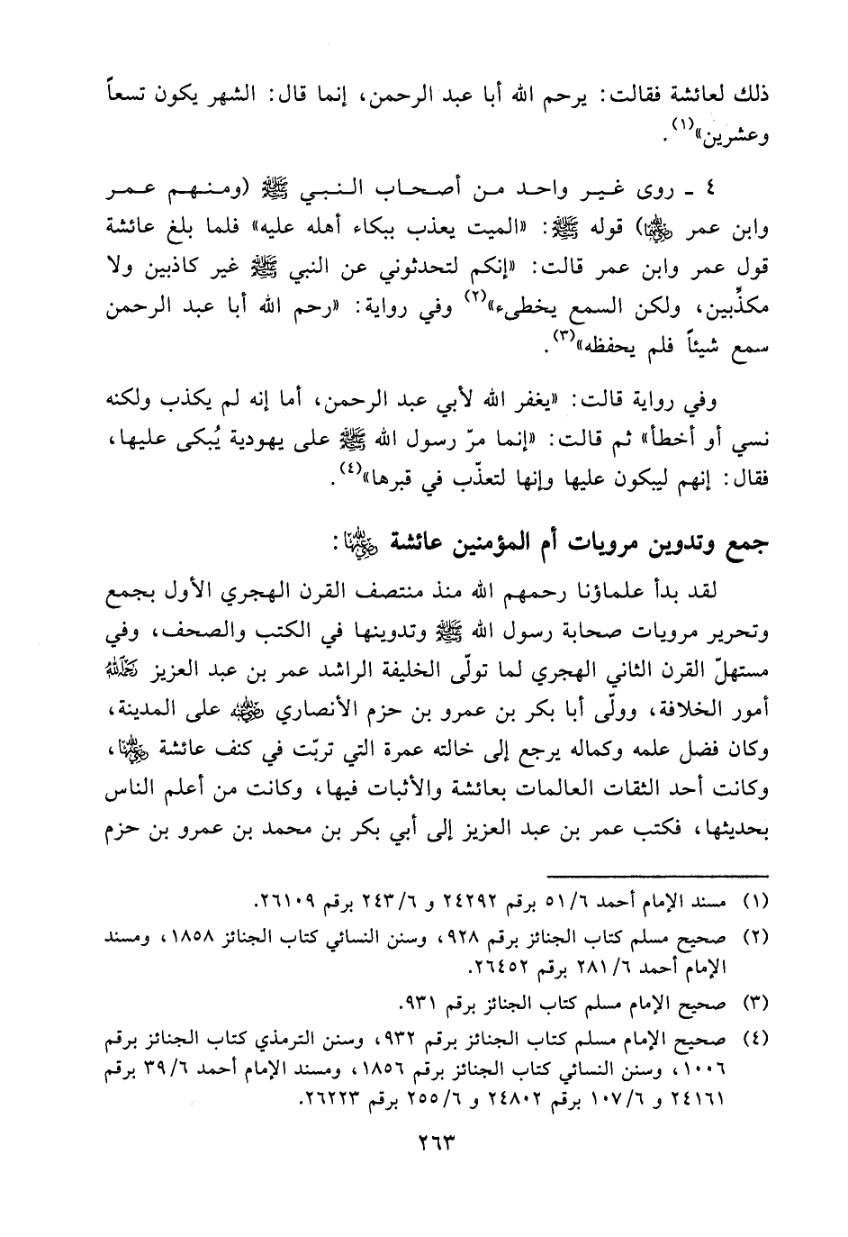 (¬4) صحيح الإمام مسلم كتاب الجنائز برقم 932، وسنن الترمذي كتاب الجنائز برقم 1006، وسنن النسائي كتاب الجنائز برقم 1856، ومسند الإمام أحمد 39/ 6 رقم 24161 و 107/ 6 برقم 24802 و 6/ 255 برقم 26223.