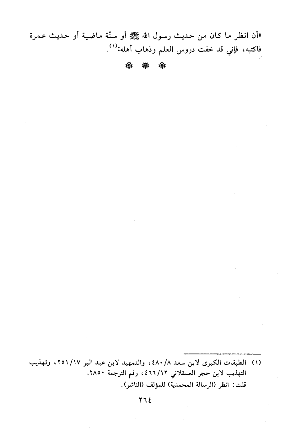 ((أن انظر ما كان من حديث رسول الله - صلى الله عليه وسلم - أو سنة ماضية أو حديث عمرة فاكتبه، فإني قد خفت دروس العلم وذهاب أهله)) (¬1).