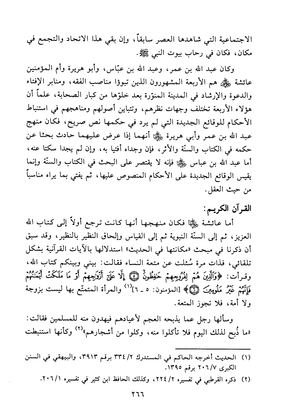 أما عائشة (ض) فكان منهجها أنها كانت ترجع أولا إلى كتاب الله العزيز، ثم إلى السنة النبوية ثم إلى القياس وإلحاق النظير بالنظير، وقد سبق أن ذكرنا في مبحث ((مكانتها في الحديث)) استدلالها بالآيات القرآنية بشكل تلقائي، فذات مرة سئلت عن متعة النساء فقالت: بيني وبينكم كتاب الله، وقرأت: {وَالَّذِينَ هُمْ لِفُرُوجِهِمْ حَافِظُونَ (*) إِلَّا عَلَى أَزْوَاجِهِمْ أَوْ مَا مَلَكَتْ أَيْمَانُهُمْ فَإِنَّهُمْ غَيْرُ مَلُومِينَ} [المؤمنون: 5 - 6] (¬1) والمرأة المتمتع بها ليست بزوجة ولا أمة، فلا تجوز المتعة.