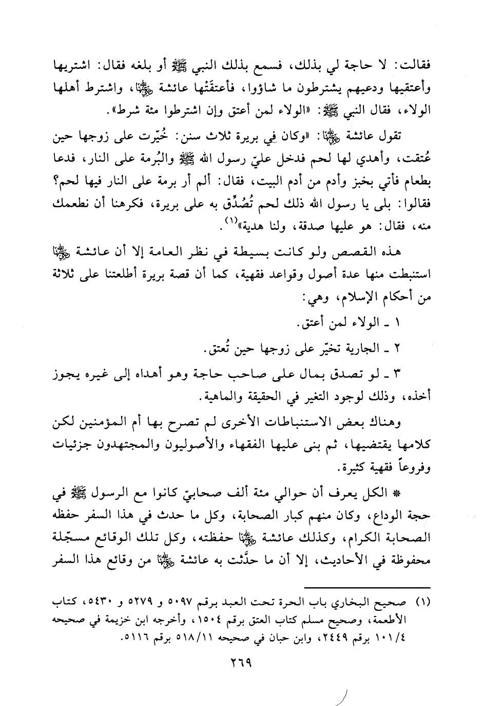 فقالت: لا حاجة لي بذلك، فسمع بذلك النبي - صلى الله عليه وسلم - أو بلغه فقال: اشتريها وأعتقيها ودعيهم يشترطون ما شاؤوا، فأعتقتها عائشة (ض)، واشترط أهلها الولاء، فقال النبي - صلى الله عليه وسلم -: ((الولاء لمن أعتق وإن اشترطوا مئة شرط)).